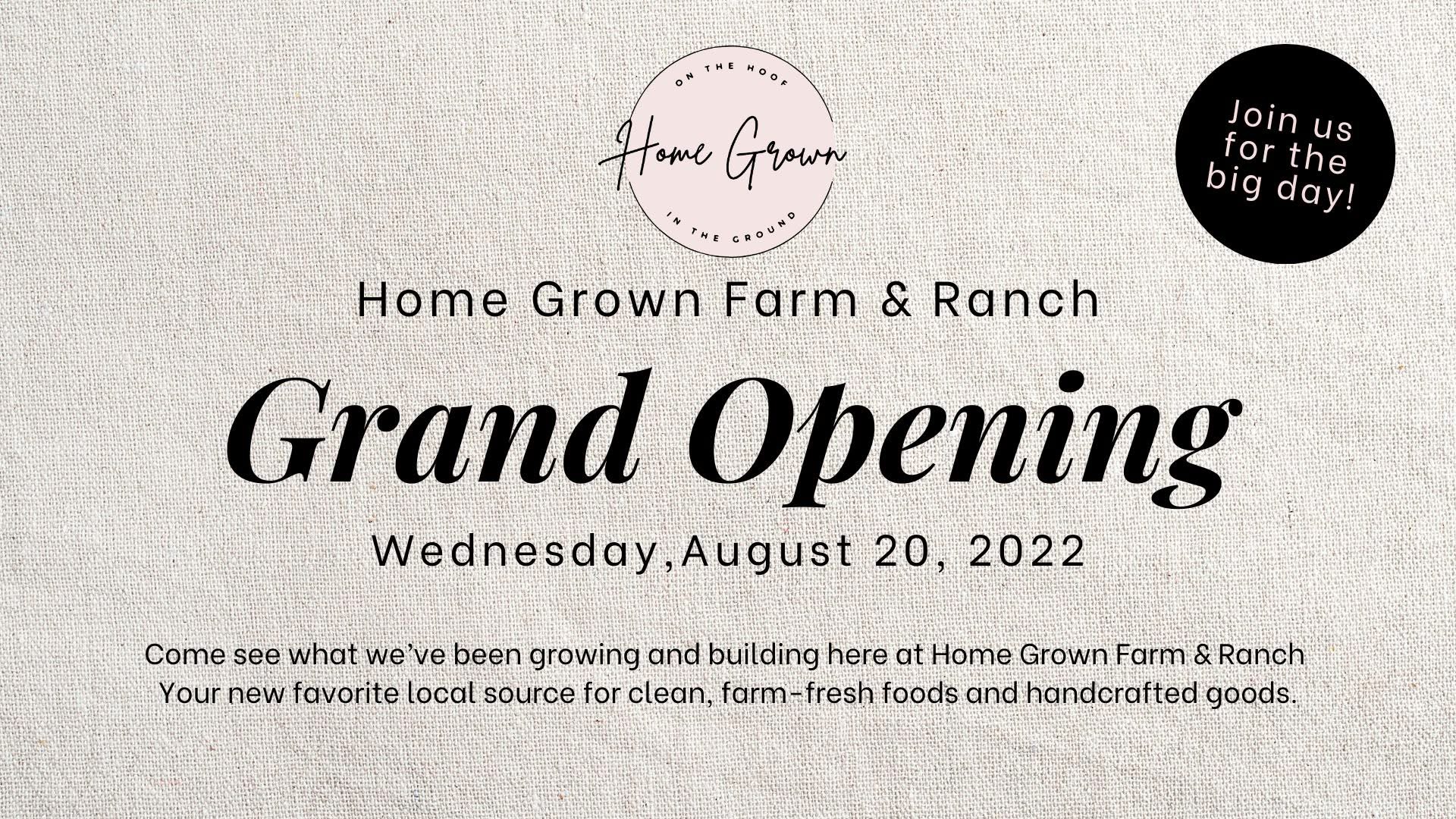 Home Grown is officially opening their doors, and youβre invited to help celebrate in style! Come see what theyβve been growing and building at Home Grown Farm & Ranch, your new favorite local source for clean, farm-fresh foods and handcrafted goods.