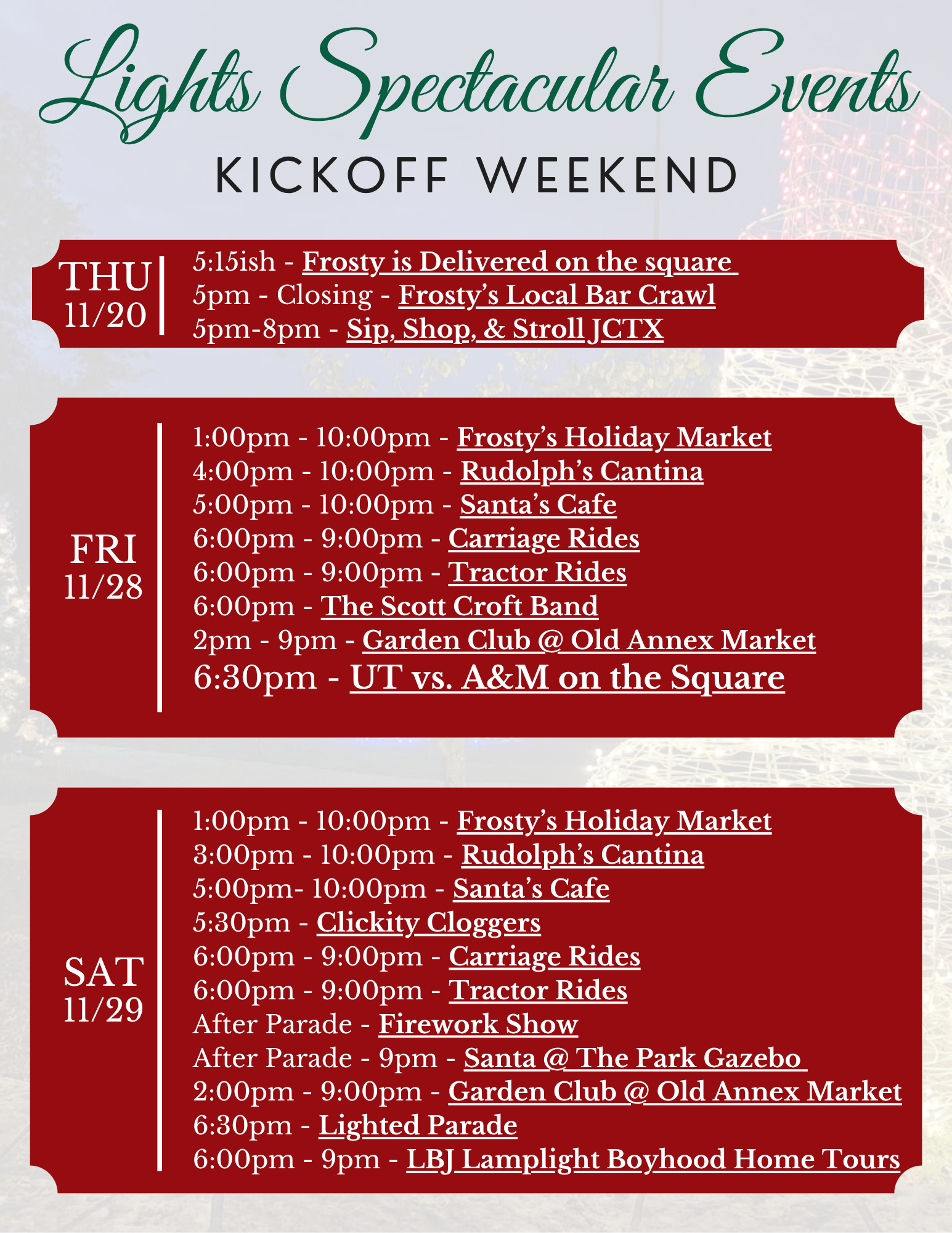 Stroll through a twinkling wonderland filled with local vendors from our Santa’s Cafe, Rudolph’s Cantina, kiddie rides, and holiday cheer. Discover one-of-a-kind gifts, seasonal treats, and handcrafted treasures while enjoying the dazzling glow of Lights Spectacular’s Opening Weekend.